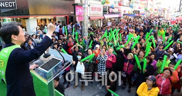 국민의당 안철수 대선후보가 26일 강원 원주시 문화의거리에서 열린 집중유세에서 시민들에게 지지를 호소하고 있다. 이동근 기자 foto@