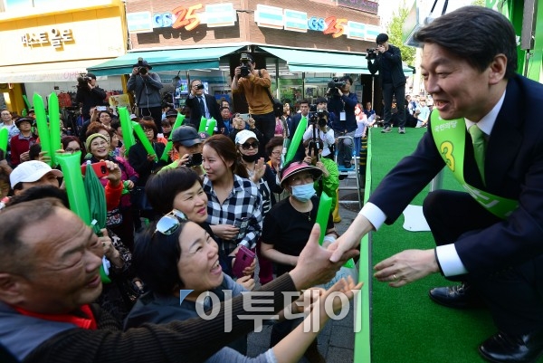 국민의당 안철수 대선후보가 26일 강원 원주시 문화의거리에서 열린 집중유세에서 연설을 마치고 시민들과 악수하고 있다. 이동근 기자 foto@