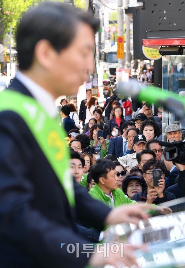 26일 강원 원주시 문화의거리에서 열린 국민의당 안철수 대선후보 집중유세에서 시민들이 안 후보의 연설을 듣고 있다. 이동근 기자 foto@