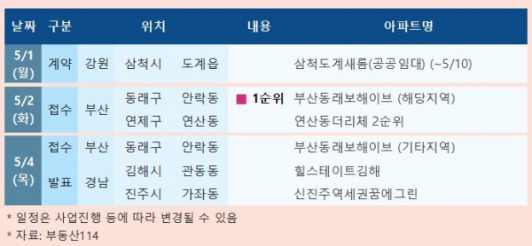 28일 부동산114에 따르면 5월 첫째 주 전국에서 1순위 청약접수를 진행하는 곳은 부산 동래구 안락동 603-12번지 '보해이브'가 유일하다. 새롭게 문을 여는 견본주택은 없다.