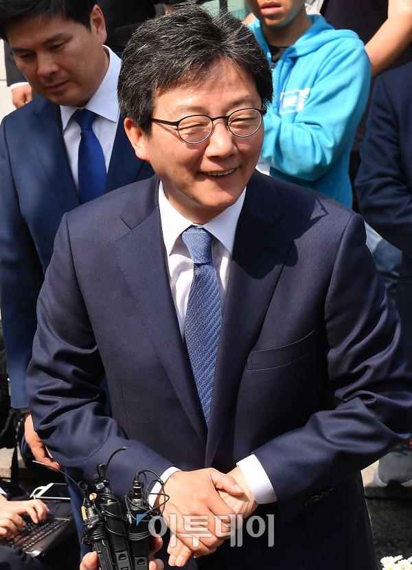제19대 대통령선거를 일주일 앞둔 2일 서울 영등포구 영등포경찰서 중앙지구대 방문을 마친 바른정당 유승민 대선후보가 지구대를 나서고 있다. 한편 이날 바른정당 권성동, 김성태 의원 등 비유승민계 의원 13명이 국회 정론관에서 기자회견을 열고 탈당 및 자유한국당 홍준표 후보 지지 선언을 했다. 정운천 의원은 3일 탈당하기로 했다. 이동근 기자 foto@