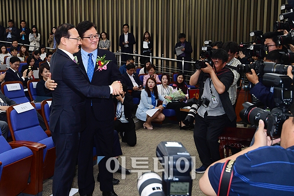 더불어민주당 원내대표 선거에 출마한 홍영표(왼쪽), 우원식 의원이 16일 오전 서울 여의도 국회에서 열린 2기 원내대표 선거에서 포옹을 하고 있다. 고이란 기자 photoeran@