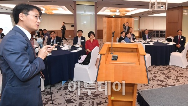 김주원 농협금융지주 팀장이 30일 서울 중구 롯데호텔에서 열린 윤경SM포럼 5월 정기모임에서 '윤리경영의 나비효과'를 주제로 강연하고 있다. 이동근 기자 foto@