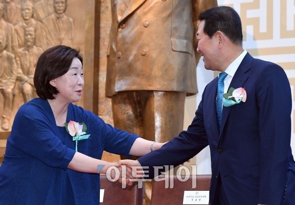 정의당 심상정 공동대표(왼쪽)와 국민의당 박주선 비상대책위원장이 31일 서울 여의도 국회에서 열린 제69주년 국회개원기념식에서 악수하고 있다. 이동근 기자 foto@