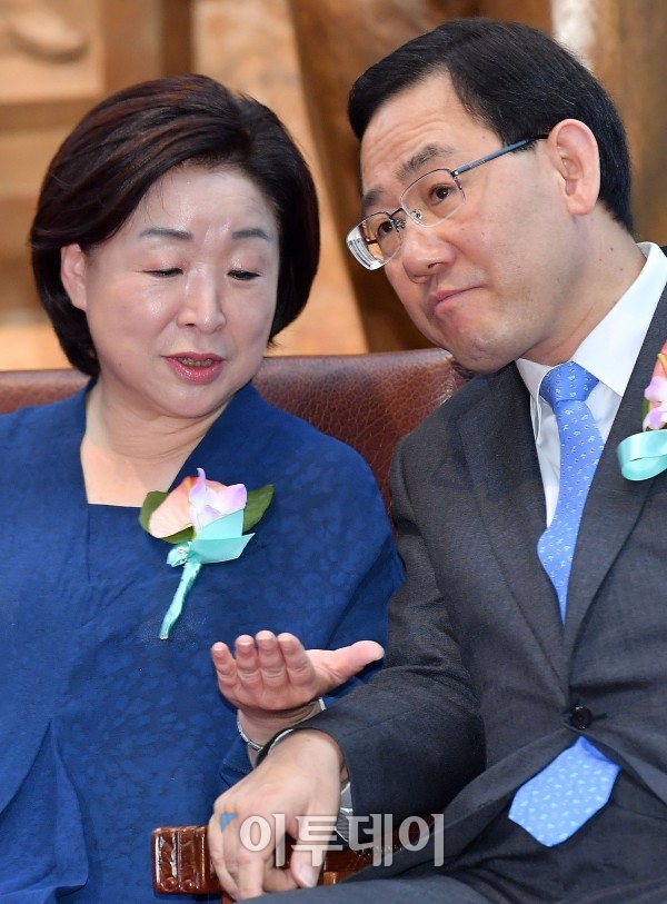 정의당 심상정 공동대표(오른쪽)와 바른정당 주호영 원내대표가 31일 서울 여의도 국회에서 열린 제69주년 국회개원기념식에서 대화하고 있다. 이동근 기자 foto@