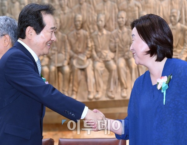정세균 국회의장(왼쪽)과 정의당 심상정 공동대표가 31일 서울 여의도 국회에서 열린 제69주년 국회개원기념식에서 악수하고 있다. 이동근 기자 foto@