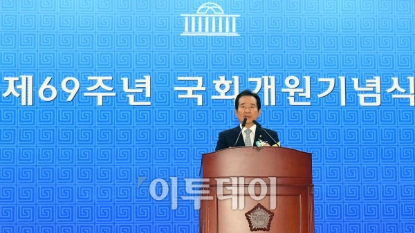 정세균 국회의장이 31일 서울 여의도 국회에서 열린 제69주년 국회개원기념식에서 축사를 하고 있다. 이동근 기자 foto@