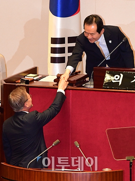 문재인 대통령(왼쪽)이 12일 서울 여의도 국회 본회의장에서 추가경정 예산안 협력을 당부하는 첫 시정연설을 마치고 정세균 국회의장과 악수를 하고 있다. 고이란 기자 photoeran@