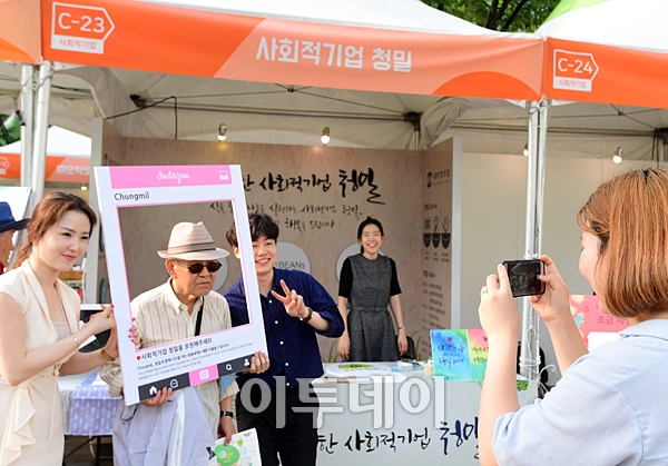 2017 사회적경제박람회가 29일 서울광장에서 열린 가운데 시민이 홍보 부스에서 기념촬영을 하고 있다. 다음달 1일까지 열리는 이번 행사는 '일상에서 만나는 사회적 경제'를 주제로 전국 180여개 사회적경제 기업이 제품·서비스체험 등을 선보인다. 고이란 기자 photoeran@