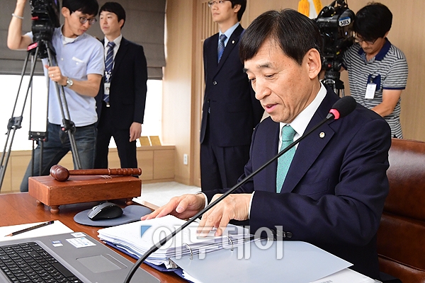 이주열 한국은행 총재가 13일 오전 서울 중구 세종대로 한국은행에서 열린 금융통화위원회에서 자료를 살펴보고 있다. 고이란 기자 photoeran@