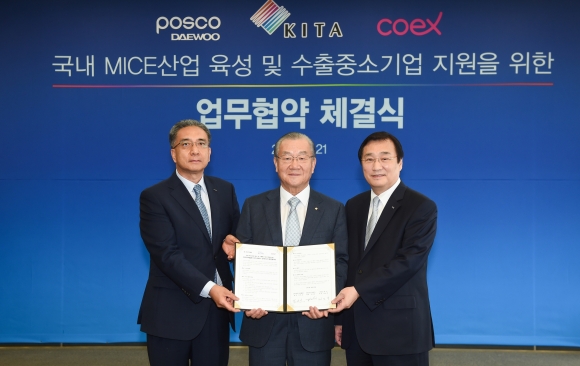 포스코대우는 지난 21일 서울 삼성동 트레이드타워에서 한국무역협회, 코엑스와 MICE 산업 발전에 대한 상호 협력과 중소기업의 해외 마케팅 지원을 위한 양해각서(MOU)를 체결했다.