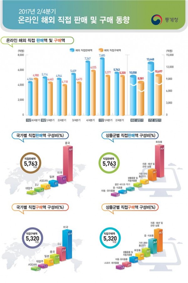 2분기 온라인 해외 직접판매액은 5763억 원으로 전년 동기보다 16.6% 증가했다. 국가별로는 중국 4405억 원, 미국 411억 원, 일본 318억 원 순으로 집계됐다. 상품군별로는 화장품(4286억 원)과 의류·패션 및 관련 상품(846억 원)이 대부분을 차지했다.