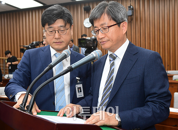 김명수 대법원장 후보자(오른쪽)가 12일 오전 서울 여의도 국회에서 인사청문회에 앞서 대법원 관계자와 자료를 살펴보고 있다. 고이란 기자 photoeran@