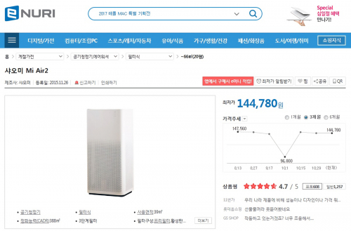7일 가격비교 사이트 에누리 가격비교에 따르면 9월 공기청정기 매출이 전년 같은 달보다 약 87% 상승했다. 10월까지 연간 누적 매출도 지난해에는 2015년 대비 38% 증가했지만, 올해는 158%까지 증가했다.