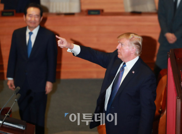 국빈 방문 중인 도널드 트럼프 미국 대통령이 8일 오전 서울 여의도 국회 본회의장에서 연설을 마친뒤 손가락으로 의원들을 가리키며 인사를 하고 있다. 이번 국회 연설은 미국 역대 대통령 중 7번째로, 1993년 빌 클린턴 대통령에 이어 24년 만이다. 사진공동취재단
