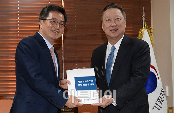 김동연(왼쪽) 경제부총리 겸 기획재정부 장관이 16일 서울 종로구 정부서울청사 집무실에서 박용만 대한상공회의소 회장을 만나 경제계 정책건의서를 받고 있다. 고이란 기자 photoeran@