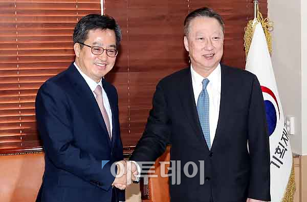 김동연(왼쪽) 경제부총리 겸 기획재정부 장관이 16일 서울 종로구 정부서울청사 집무실에서 박용만 대한상공회의소 회장을 만나 악수를 하고 있다. 고이란 기자 photoeran@