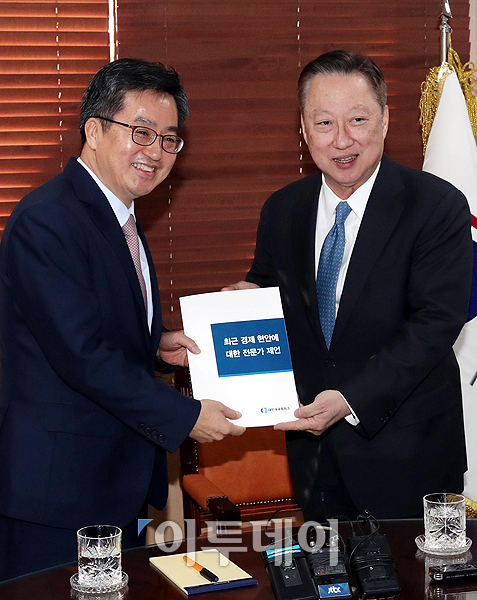 김동연(왼쪽) 경제부총리 겸 기획재정부 장관이 16일 서울 종로구 정부서울청사 집무실에서 박용만 대한상공회의소 회장을 만나 경제계 정책건의서를 받고 있다. 고이란 기자 photoeran@