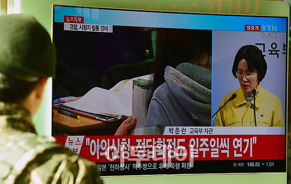포항에서 발생한 지진 피해로 대학수학능력시험이 1주일 연기된 가운데 16일 서울역 대합실에서 한 군인이 관련뉴스를 보고 있다. 이날 박춘란 교육부 차관은 정부세종청사에서 기자회견을 열고 대입일정 등 후속조치를 발표했다. 고이란 기자 photoeran@