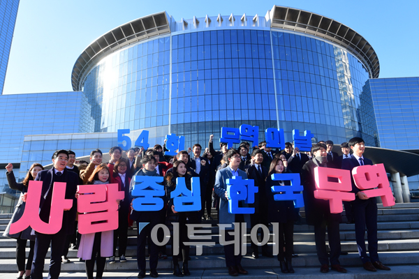 제54회 무역의 날을 하루 앞둔 4일 서울 강남구 코엑스 동측광장에서 무역협회 관계자들이 무역의 날 기념 퍼포먼스를 하고 있다. 고이란 기자 photoeran@