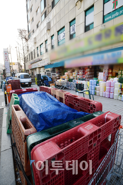 29명의 희생자가 발생한 제천 화재 참사로 불법주차와 기본적인 안전수칙 등에 대한 경각심이 높아지고 있는 가운데 26일 오전 서울 영등포구의 한 상가 앞에 물건들이 차량통행로를 막고있다. 지난 23일 발생한 제천 화재 참사 당시 불법주차로 인해 소방차들은 현장 접근과 구조에 어려움을 겪었다. 고이란 기자 photoeran@