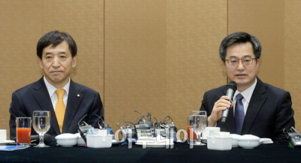 김동연(오른쪽) 경제부총리 겸 기획재정부 장관이 4일 오전 서울 중구 은행회관에서 열린 이주열 한국은행 총재와의 조찬회동에 앞서 모두발언을 하고 있다. 이동근 기자 foto@