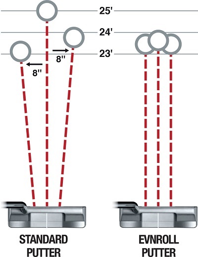 이븐롤 퍼터가 다른 제품과 차별화된 것은 바로 그루브 기술이다. 스위트 페이스 테크놀리지를 적용해 볼이 페이스테 타격될 때 타격 영역 전체에 균일한 에너지 전달한다. 이는 스트로크시 볼이 홀에 직진하며 거리가 일정하게 맞춰진다는 얘기다. 볼이 맞을 때 페이스 중앙을 벗어나더라도 일정한 방향성을 유지한다는 것이다.