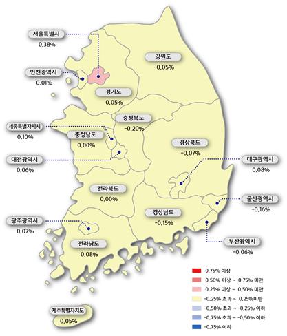 시도별로는 서울(0.38%), 세종(0.10%), 전남(0.08%), 대구(0.08%)등은 올랐고 전북(0.00%)과 충남(0.00%)은 보합, 충북(-0.20%), 울산(-0.16%), 경남(-0.15%), 경북(-0.07%) 등은 떨어졌다.
