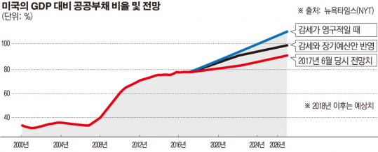 미국 의회예산국(CBO)은 지난해 6월 미국의 GDP 대비 공공부채 비율이 2017년의 77%에서 2027년 91%로 높아질 것이라고 내다봤다. CBO가 감세와 재정지출 확대 변수를 넣지 않았다는 것을 감안하면 그 수치는 더욱 높아질 수밖에 없다.
