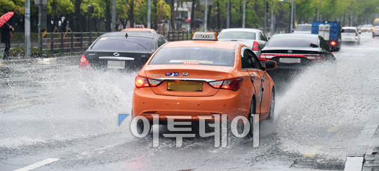 비교적 많은 양의 봄비가 내린 23일 오전 서울 여의도에서 차량들이 물보라를 일으키며 운행하고 있다. 기상청은 비가 오는 지역에서는 돌풍과 함께 천둥, 번개가 칠 수 있어 시설물 관리에 유의할 것을 당부했다. 오승현 기자 story@