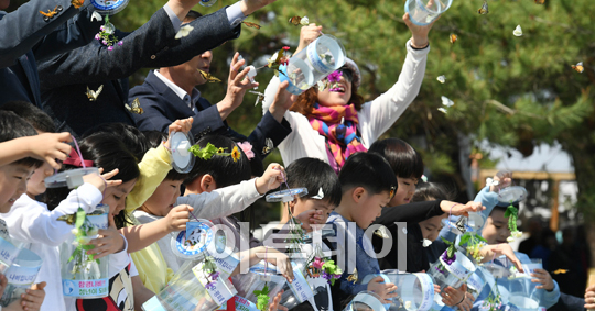 남북정상회담을 이틀 앞둔 25일 경기도 파주시 임진각 망배단에서 이건택 민주평화통일자문회의 함평군협의회장과 파주지역 어린이들이 한반도 최남단에서 최북단까지의 거리를 상징하는 나비 1178마리를 하늘로 날려 보내며 회담 성공개최를 기원하고 있다. 오승현 기자 story@