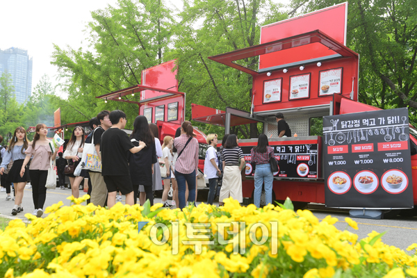 대학 축제 시즌이 다가온 가운데 15일 서울 광진구 건국대학교에서 학생들이 푸드트럭 앞에 줄을 서고 있다. 고이란 기자 photoeran@