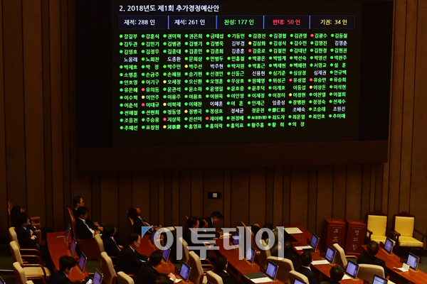 21일 서울 여의도 국회에서 열린 본회의에서 2018년도 제1회 추가경정예산안이 재적 288명, 재석 261명 가운데 찬성 177명, 반대 50명, 기권 34명으로 통과되고 있다. 고이란 기자 photoeran@