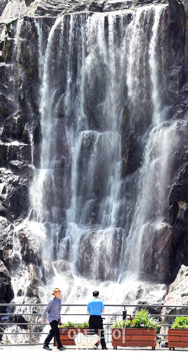 대구와 울산의 한낮 기온이 28℃까지 오르는 등 초여름 날씨를 보인 24일 서울 중랑구 용마폭포공원에서 시민들이 시원스레 쏟아지는 폭포수를 즐기고 있다. 용마산 기슭의 광물 채석장을 공원으로 조성한 용마폭포공원은 아시아 최대 인공폭포(용마폭포 51.4m, 청룡폭포 21.4m, 백마폭포 21m)로써 매년 5월부터 9월까지 폭포수가 시원하게 낙하하며 장관을 이루고 있다. 오승현 기자 story@