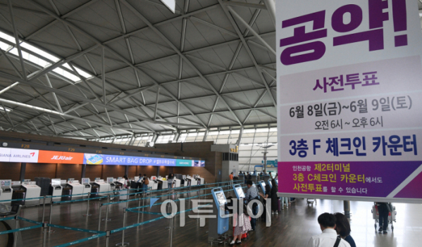 '제7회 전국동시지방선거' 및 '국회의원 재·보궐선거'의 사전투표일을 앞둔 6일 인천국제공항 제1여객터미널 출국장에 사전투표일과 사전투표소를 알리는 배너가 걸려있다. 오는 8일부터 이틀간 진행되는 사전투표는 별도의 부재 신고 없이 신분증만 지참하고 읍·면·동사무소에 설치된 투표소에서 투표할 수 있다. 오승현 기자 story@