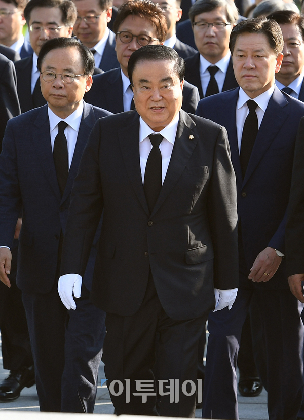 '제70주년 제헌절'인 17일 오전 서울 동작구 국립서울현충원에서 문희상 신임 국회의장을 비롯한 의장단과 여야 지도부 및 의원들이 현충탑을 참배하며 호국영령의 넋을 기리고 있다. 오승현 기자 story@