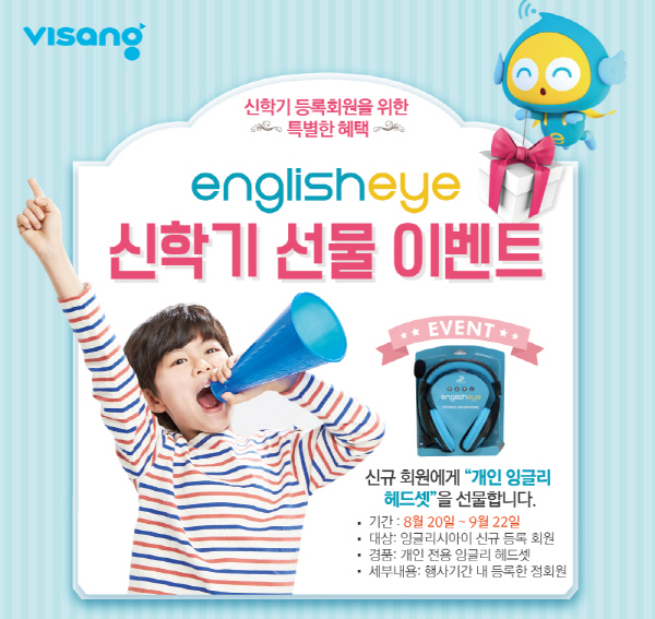 이번에 잉글리시아이가 실시하는 이벤트는 오는 9월 22일까지 진행된다. 기간 내에 전국의 잉글리시아이 학원에 신규 등록하는 모든 회원은 잉글리 캐릭터가 새겨진 1만 4000원 상당의 고급 헤드셋을 증정 받을 수 있다.