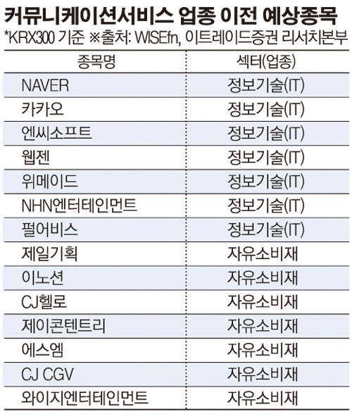 안진아 이베스트투자증권 연구원은 “커뮤니케이션서비스 업종은 4차 산업을 대표하는 성장주들이 대거 포함될 전망”이라며 “신규 업종이 재평가되고 주목을 받으면 이를 추종하는 ETF(상장지수펀드) 자금 등도 늘어날 것으로 본다”고 설명했다.
