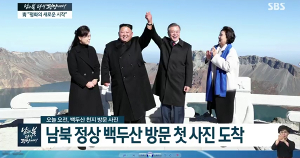 문재인 대통령과 김정은 북한 국무위원장 내외는 20일 백두산 천지에 도착했다. 현장에 찍힌 네 사람은 손을 맞잡은 채 하늘로 높이 뻗어 화해 국면에 접어든 남북 분위기를 표현했다.