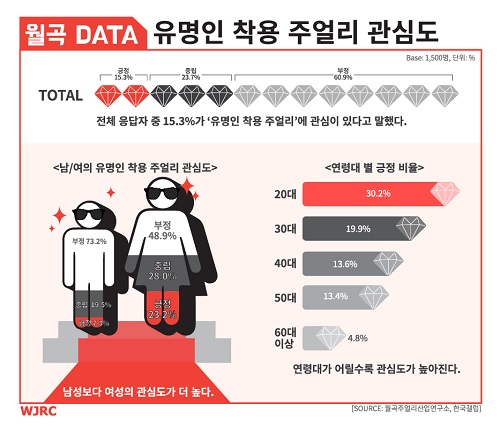 월곡주얼리산업연구소가 한국갤럽과 공동으로 시행하고 있는 ‘JAS(주얼리 구매율 조사; Jewelry Acquisition Survey) 17차 조사’ 결과에 따르면, 유명인이 착용한 주얼리에 대해 관심이 있다고 응답한 비율은 전체 응답자의 15.3%로 조사됐다.
