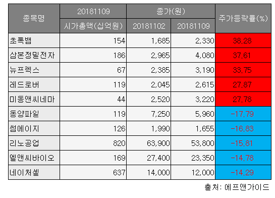 한 주간 코스닥시장에서 가장 크게 급등한 종목은 초록뱀(38.28%)이다. 12월부터 방영되는 현빈·박신혜 주연 ‘알함브라 궁전의 추억’에 대한 판매 기대감이 반영된 것으로 풀이된다. 스튜디오드래곤과 공동으로 대규모 제작비를 투입한 초록뱀은 52주 신고가를 경신하며 상승세를 이어갔다.