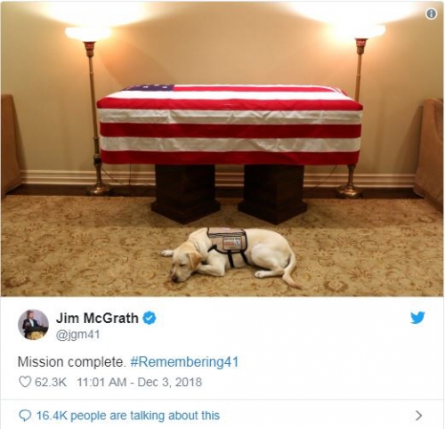 부시 전 대통령의 대변인인 짐 맥그레이스는 이날 트위터에 부시 전 대통령의 관을 지키는 설리의 사진을 올리면서 ‘임무 완수(Mission complete)’라는 글을 달았다.