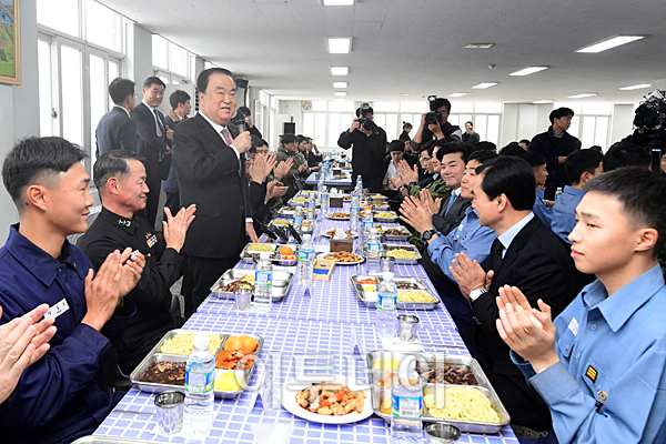 문희상 국회의장이 13일 경기도 평택 해군 2함대를 찾아 오찬에 앞서 군부대원들에게 인사말을 하고 있다. 평택=고이란 기자 photoeran@