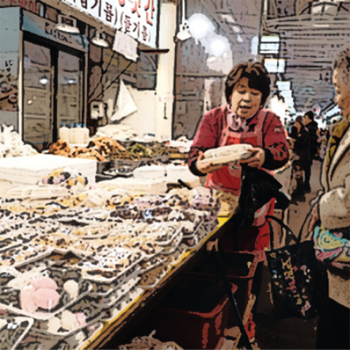 호떡집을 지나 오른편으로 난 작은 골목으로 들어서면 ‘행복죽집’이 있다. 팥죽에 녹두죽 열심히 팔아 아들 딸 모두 대학까지 공부시켰노라 은근슬쩍 자랑이 넘치는 주인댁 아줌마. 가게 한쪽 벽엔 상인대학 수료식 때 평생 소원이던 학사모를 쓰고 찍은 사진이 걸려 있다. 동짓날이면 손이 열 개라도 모자랄 판인데, 마침 재작년엔 딸 친구들이 우렁각시가 되어주었고 작년엔 며느리가 열일 젖히고 달려와 한결 수월했노라 하신다. 새알심 듬뿍 넣은 따끈따끈한 팥죽과 고운 빛깔의 까끌까끌한 녹두죽은 역시 한겨울에 먹어야 제 맛이 나는 듯싶다.