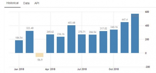 ▲중국 무역수지 추이. 단위 억 달러. 작년 12월 570억6000만 달러 흑자. 출처 트레이딩이코노믹스