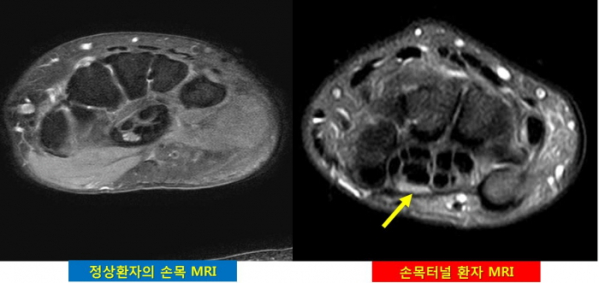 손목터널증후군의 원인은 가사노동처럼 반복적인 손목 사용으로 횡수근 인대가 두꺼워지면서 아래 수근관터널(손목터널)을 누르기 때문이다. 문제는 이 터널 안에는 우리 손의 감각, 움직임을 관장하는 ‘정중신경’이 지난다. 따라서 지속적으로 압박을 받을 경우 신경이 손상된다. 따라서 근육통으로 여기고 파스나 약물/주사 등으로 시간을 허비한다면 손상이 심화되어 수술을 시행하더라도 후유장애 위험을 배제할 수 없다.