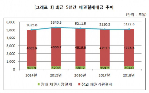 29일 한국예탁결제원에 따르면 예탁결제원을 통한 증권결제대금 중 채권결제대금 총액은 5122조6000억 원(일평균 20조9000억 원)으로 2017년 총액 5110조3000억 원(일평균 21조 원) 대비 0.2% 증가했다.