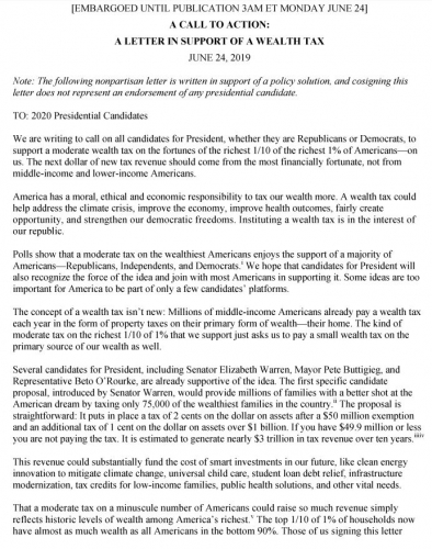 이들은 공개서한에서 “전체 1%인 미국 부자 중에서도 10분의 1에 해당하는 우리와 같은 최고 부자들에게 적당한 부유세를 부과해야 한다”며 “새로운 세수는 중산층이나 저소득층이 아닌 가장 부유한 사람들로부터 나와야 한다”고 주장했다.
