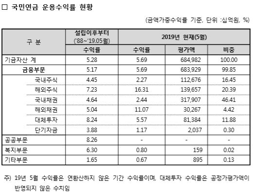 기금운용본부는 "국내 및 해외 대체투자자산의 5월 수익률은 대부분 이자·배당수익 및 원 달러 환율 상승으로 인한 외화환산이익으로 인한 것이며, 연도 말 기준 연 1회 공정가치 평가를 하므로 연중 수익률은 공정가치 평가액이 반영되지 않았다"고 설명했다.