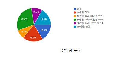 상여금(선물 금액 환산액 포함)은 30만 원에서 50만 원 사이를 받는 다는 응답이 28.2%(185명)로 가장 많았다. 이어 10만 원 이하 19.5%, 100만 원 초과 16.9% 순이었다. 상여금이 없다는 응답도 16.3%나 됐다.